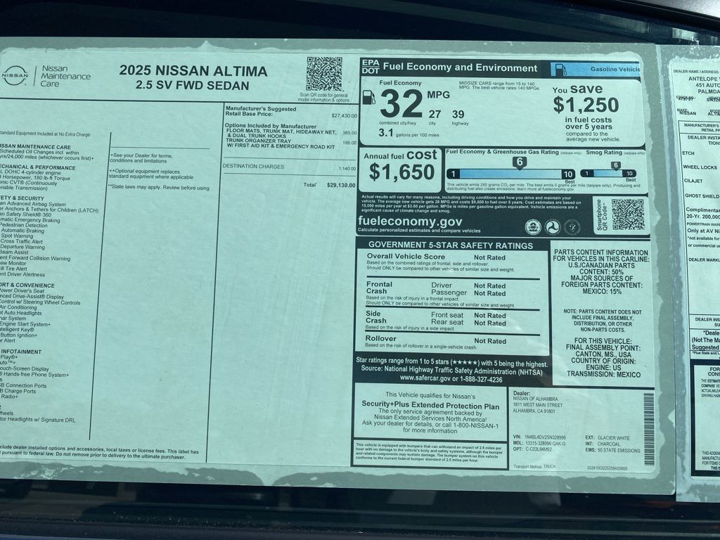 2025 Nissan Altima 2.5 SV CVT with Xtronic, Bluetooth. 27/39 City/Highway MPG 2.5L 4-Cylinder DOHC 16V