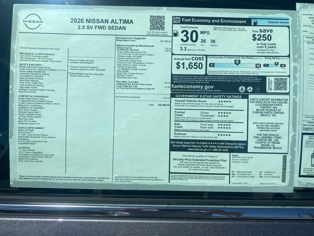 2026 Nissan Altima 2.5 SV 27/39 City/Highway MPG 2.5L 4-Cylinder DOHC 16V *Net Cost After All Applicable Discounts and Rebates: $750 - Nissan Customer Cash. Exp. 05/04/2026