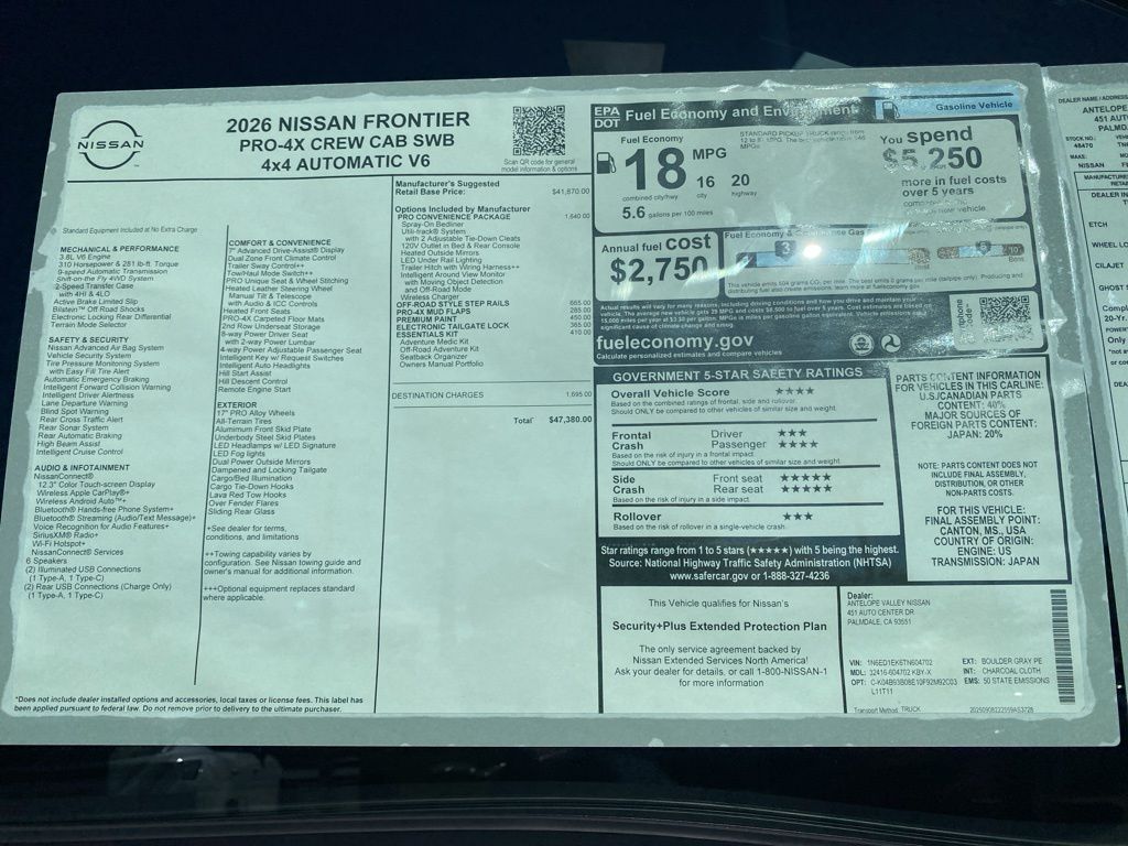 2026 Nissan Frontier PRO-4X 4WD, Bluetooth. 18/22 City/Highway MPG 3.8L DI DOHC 24V V6