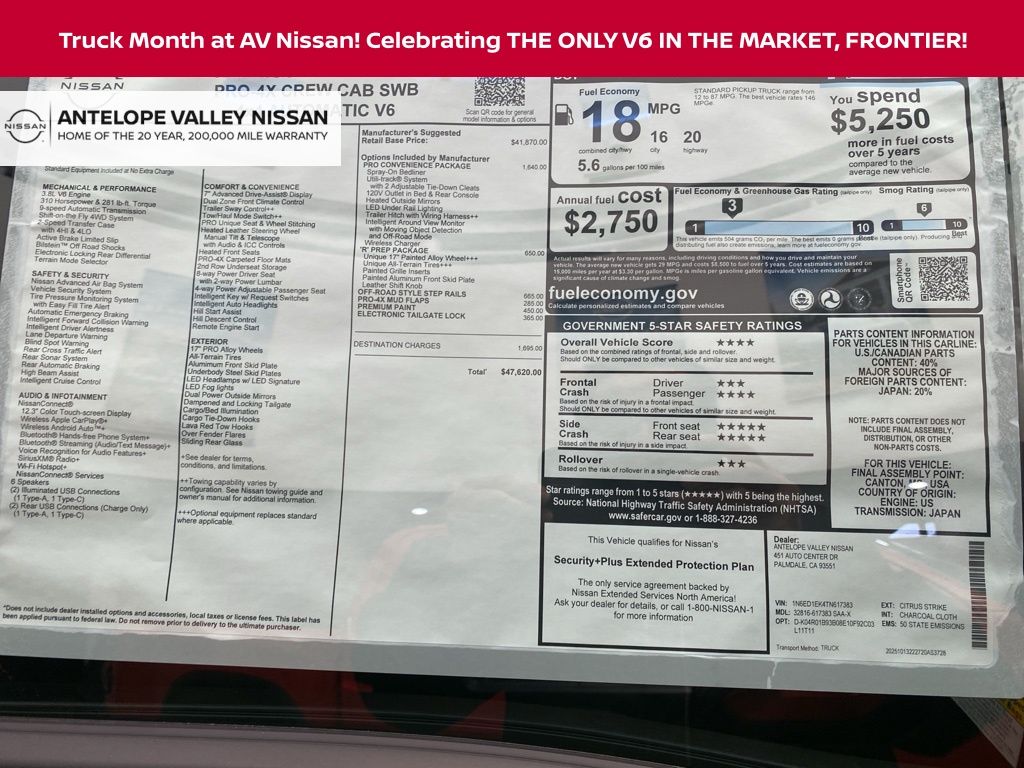 2026 Nissan Frontier PRO-4X 18/22 City/Highway MPG 3.8L DI DOHC 24V V6 *Net Cost After All Applicable Discounts and Rebates: $3500 - Nissan Customer Cash. Exp. 05/04/2026
