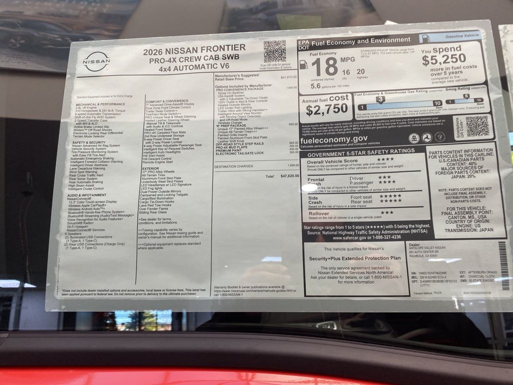2026 Nissan Frontier PRO-4X 4WD, Bluetooth. 18/22 City/Highway MPG 3.8L DI DOHC 24V V6