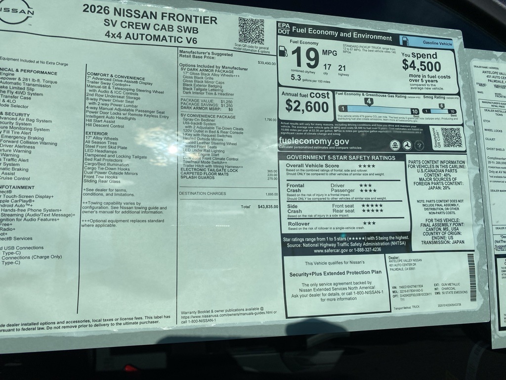 2026 Nissan Frontier SV 4WD, Bluetooth. 18/23 City/Highway MPG 3.8L DI DOHC 24V V6