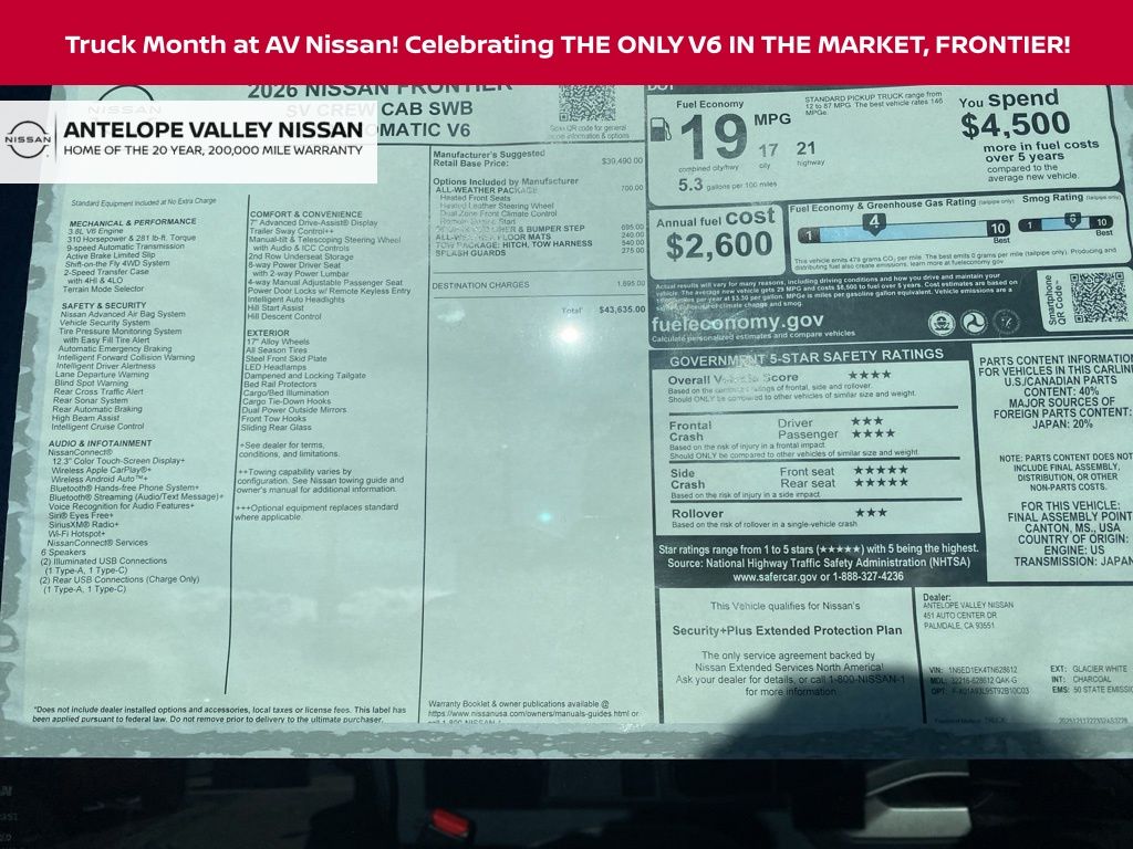2026 Nissan Frontier SV 18/23 City/Highway MPG 3.8L DI DOHC 24V V6 *Net Cost After All Applicable Discounts and Rebates: $3500 - Nissan Customer Cash. Exp. 05/04/2026