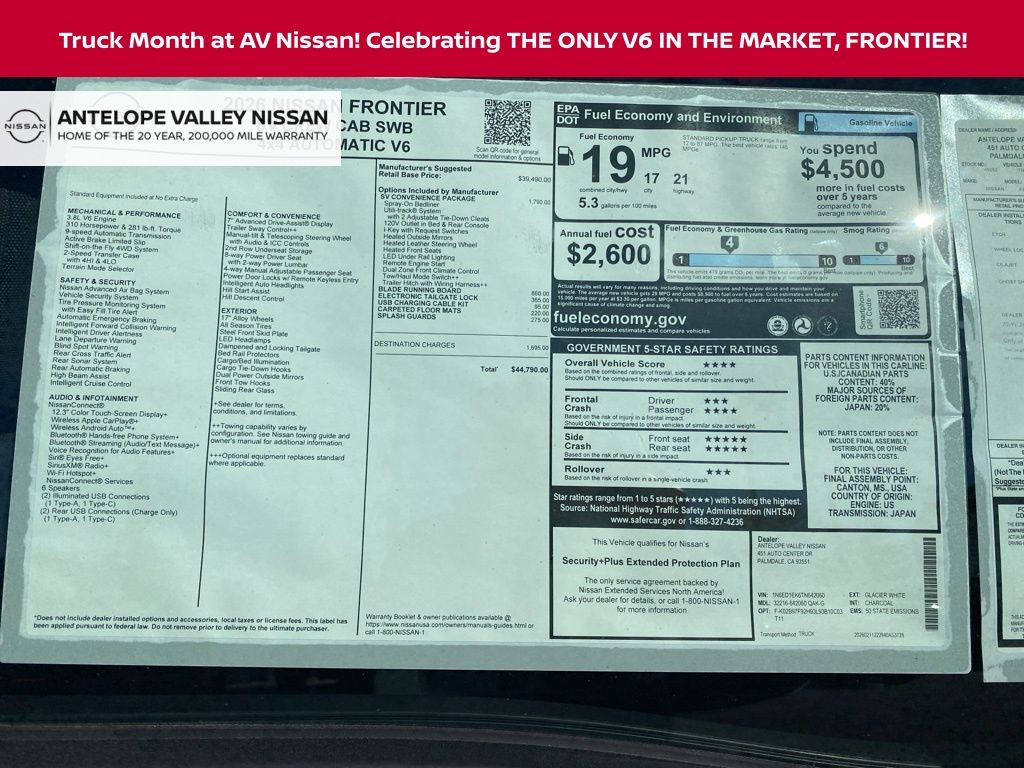 2026 Nissan Frontier SV 18/23 City/Highway MPG V6 *Net Cost After All Applicable Discounts and Rebates: $3500 - Nissan Customer Cash. Exp. 05/04/2026