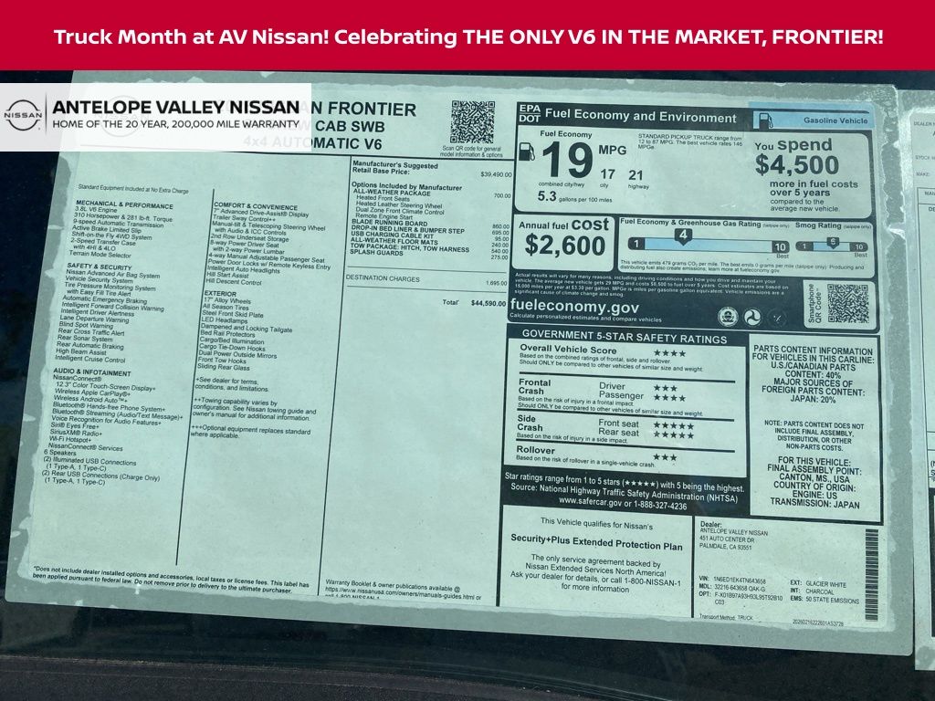 2026 Nissan Frontier SV 18/23 City/Highway MPG V6 *Net Cost After All Applicable Discounts and Rebates: $3500 - Nissan Customer Cash. Exp. 05/04/2026