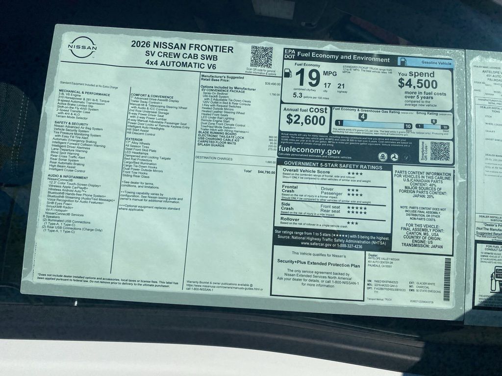 2026 Nissan Frontier SV 4WD, Bluetooth. 18/23 City/Highway MPG 3.8L DI DOHC 24V V6