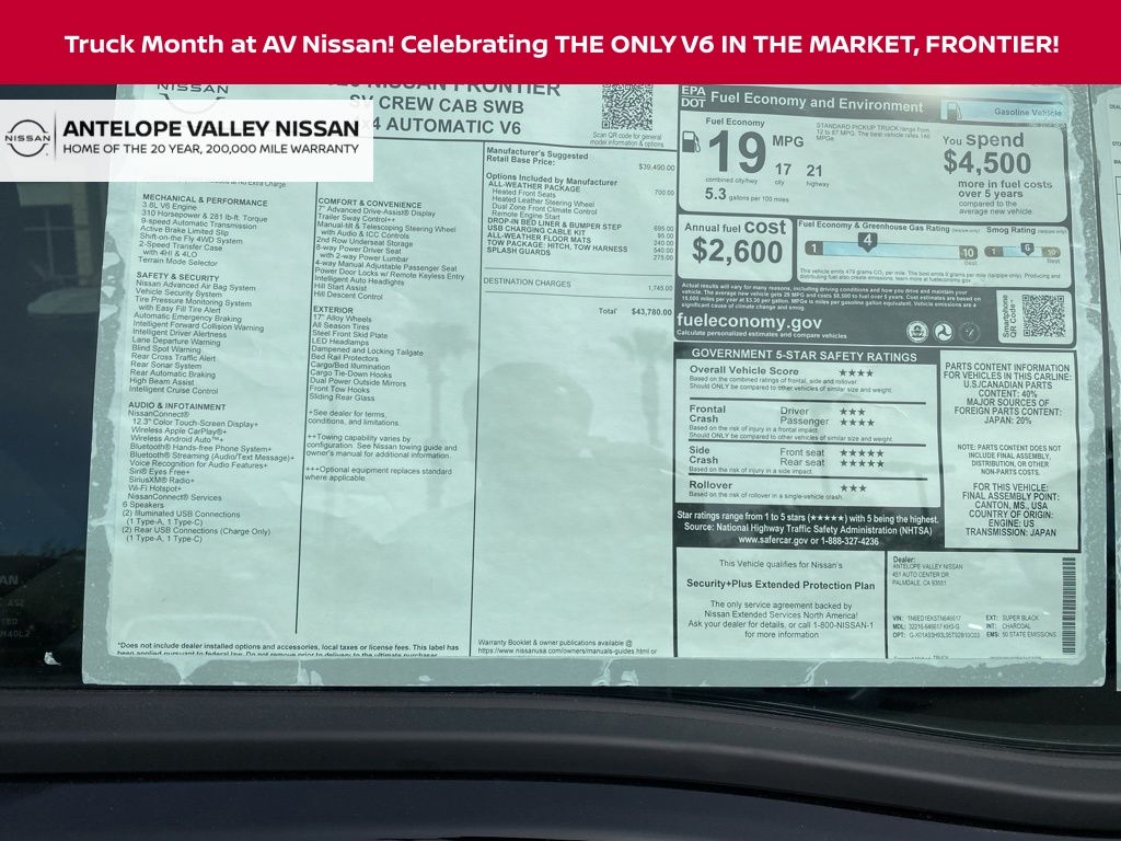 2026 Nissan Frontier SV 18/23 City/Highway MPG V6 *Net Cost After All Applicable Discounts and Rebates: $3500 - Nissan Customer Cash. Exp. 05/04/2026