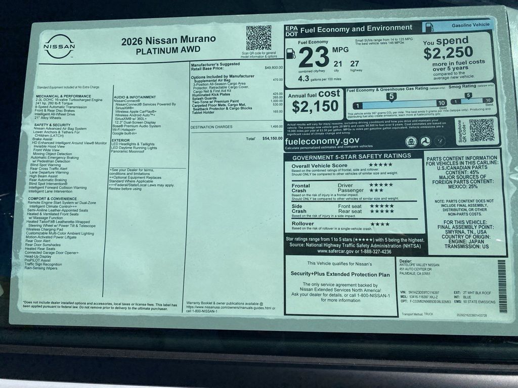 2026 Nissan Murano Platinum 9-Speed Automatic, AWD, Bluetooth. 21/27 City/Highway MPG I4