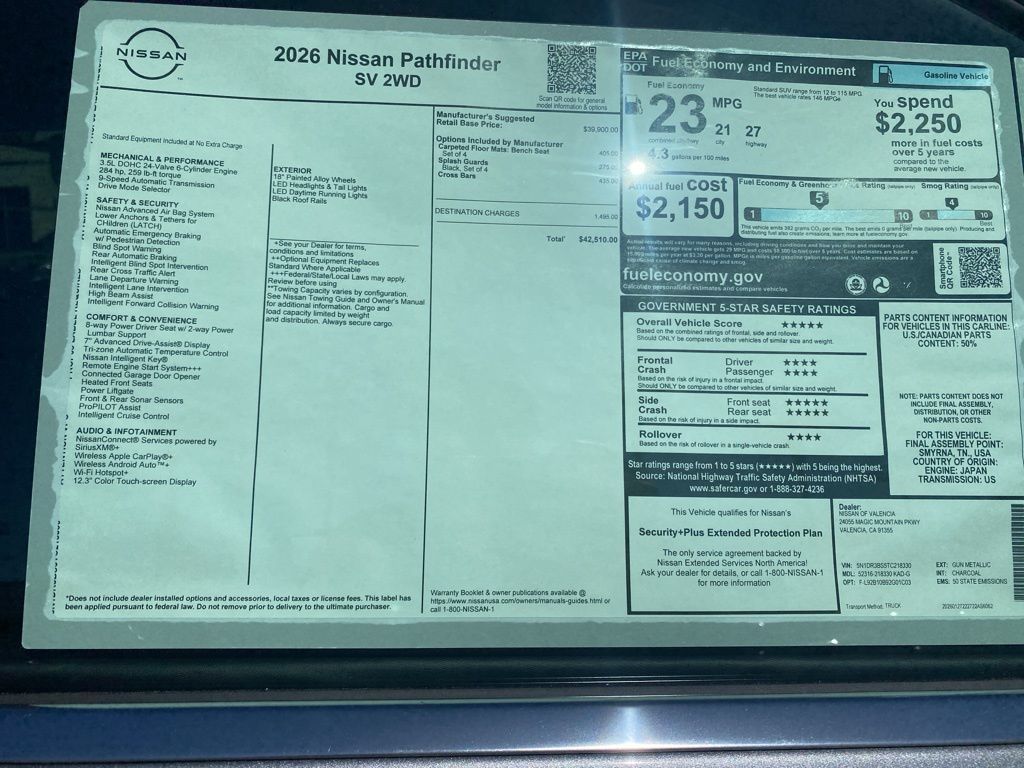 2026 Nissan Pathfinder SV Bluetooth. 20/27 City/Highway MPG 3.5L V6 DOHC