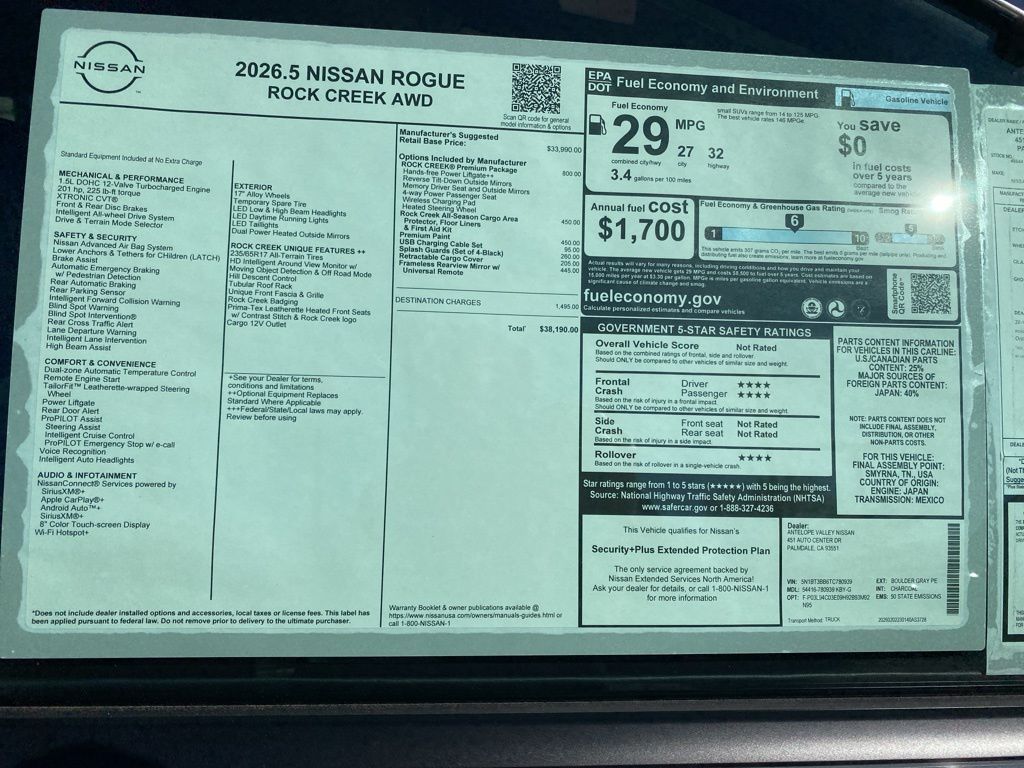 2026 Nissan Rogue Rock Creek 27/32 City/Highway MPG 1.5L DOHC *Net Cost After All Applicable Discounts and Rebates: $3500 - Nissan Customer Cash. Exp. 05/04/2026