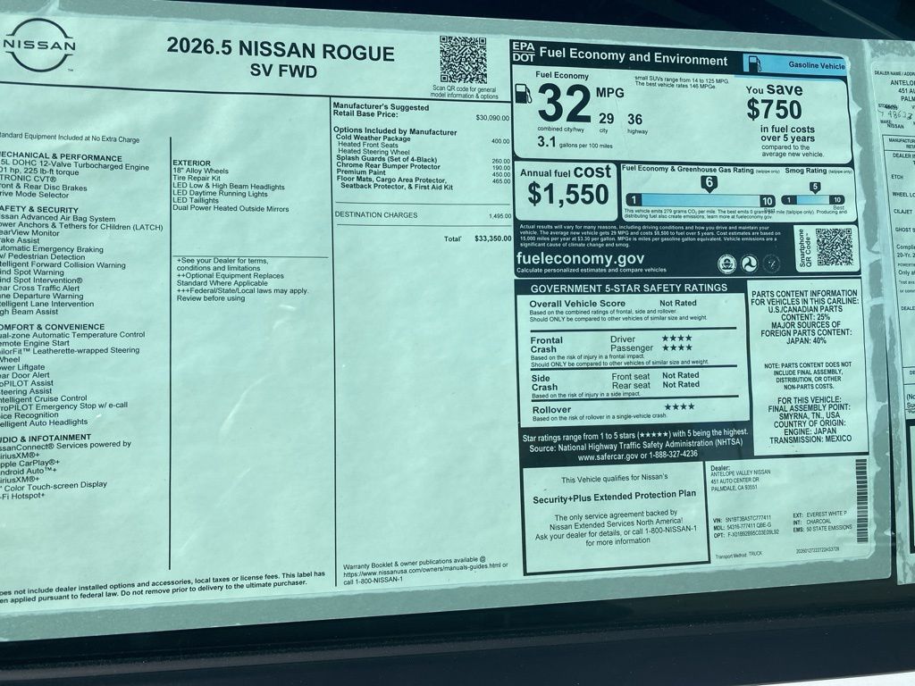 2026 Nissan Rogue SV Bluetooth. 29/36 City/Highway MPG 1.5L DOHC