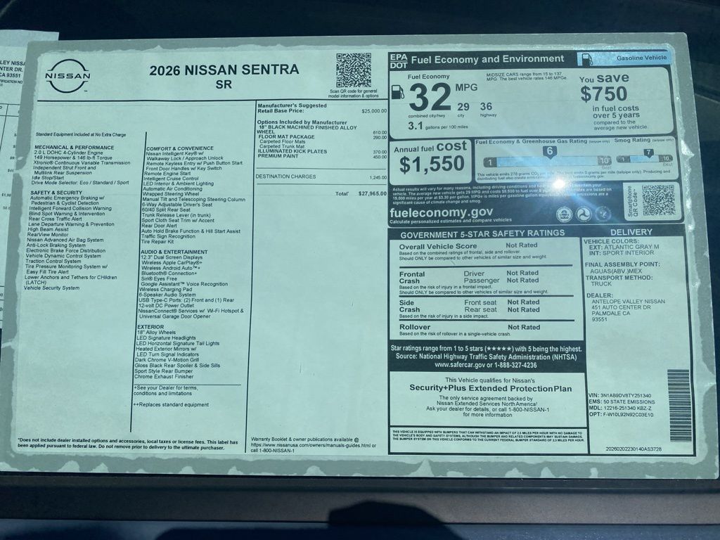 2026 Nissan Sentra SR CVT with Xtronic, Sport Cloth, Bluetooth. 30/38 City/Highway MPG 2.0L I4 DOHC