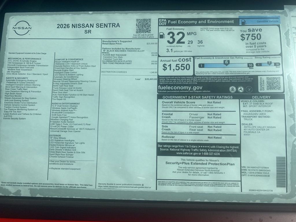 2026 Nissan Sentra SR 30/38 City/Highway MPG 2.0L I4 DOHC *Net Cost After All Applicable Discounts and Rebates: $500 - Nissan Customer Cash. Exp. 05/04/2026 $500 - Nissan WR MY26 Sentra (Excl S Trim) Customer Cash - April. Exp. 05/04/2026