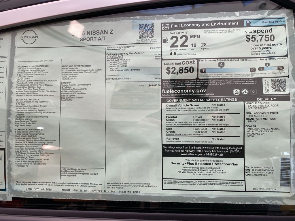 2026 Nissan Z Sport 19/28 City/Highway MPG 3.0L V6